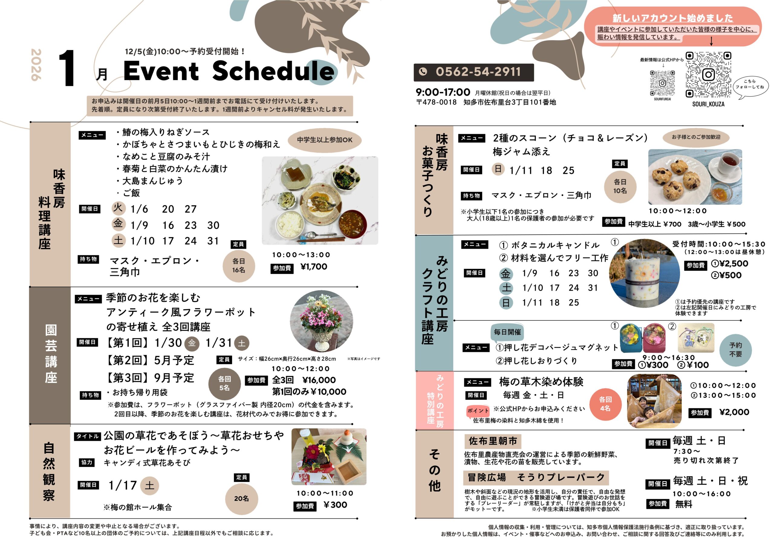 2026年1月から、佐布里緑と花のふれあい公園ではさまざまな体験講座やイベントを開催します。