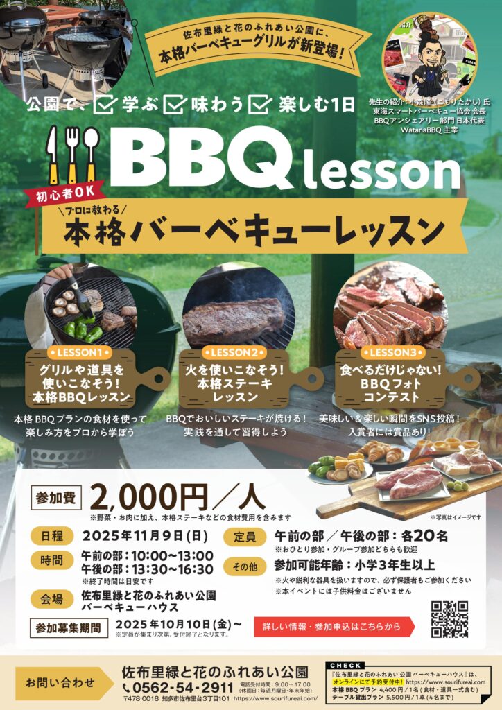 2025年10月より、知多市の佐布里緑と花のふれあい公園にて、本格的なバーベキュー機材や食材がセットになった【本格BBQプラン】が始まりました。とはいえ、本格BBQの魅力を知らない方もまだまだ多いと思います。そこで今回、豊かな自然の中でBBQのプロの技術を実技を通して学べる特別な機会を開催します。