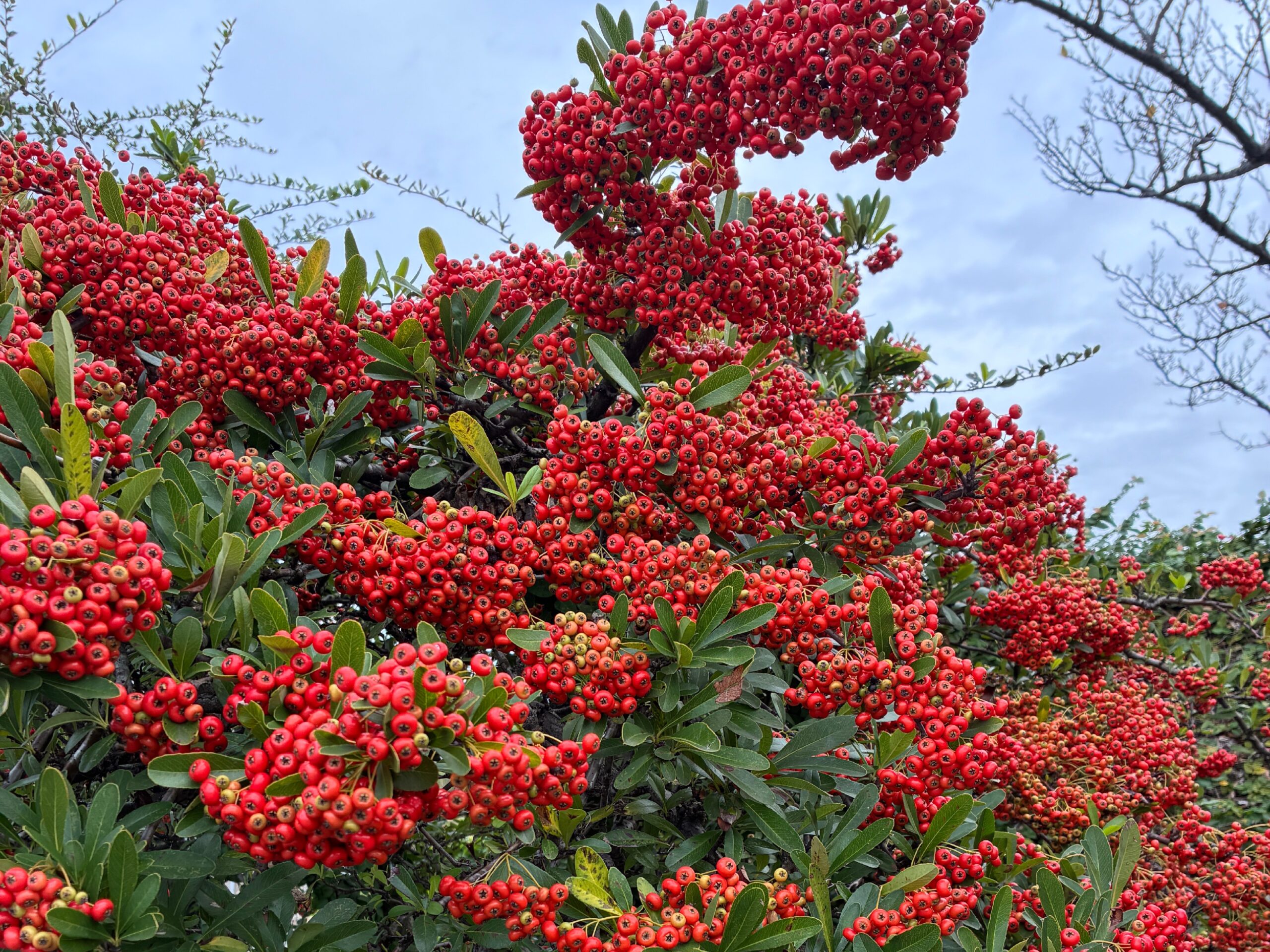 花見頃情報公園からのお知らせ 2025年10月21日 ピラカンサが見ごろです 2025.10.21 ピラカンサの色鮮やかな実が見ごろです 佐布里緑と花のふれあい公園では、ピラカンサの赤い実が真っ赤に色づき、とても美しい季節を迎えています。近くには鮮やかな黄色の実をつけた木もあり、赤と黄のコントラストが秋の園内を彩ります。 散策しながら秋の実りを楽しめるこの時期、ぜひ公園で彩り豊かな風景をご覧ください。