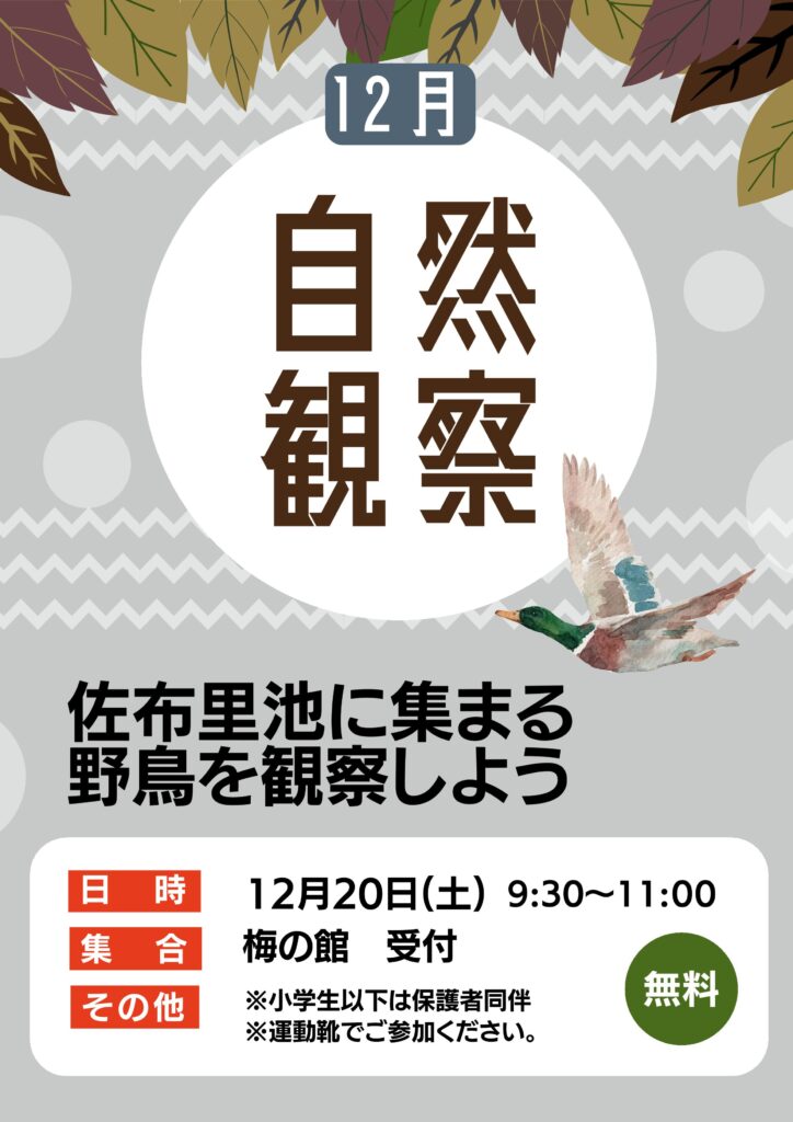 2025年12月20日(土)、佐布里緑と花のふれあい公園で冬の自然観察会を開催します。渡り鳥や冬鳥が集まる佐布里池で、双眼鏡を片手に鳥の姿や行動をじっくり観察。知多自然観察会の先生が園内を案内し、鳥の名前や特徴、見どころを丁寧に解説します。