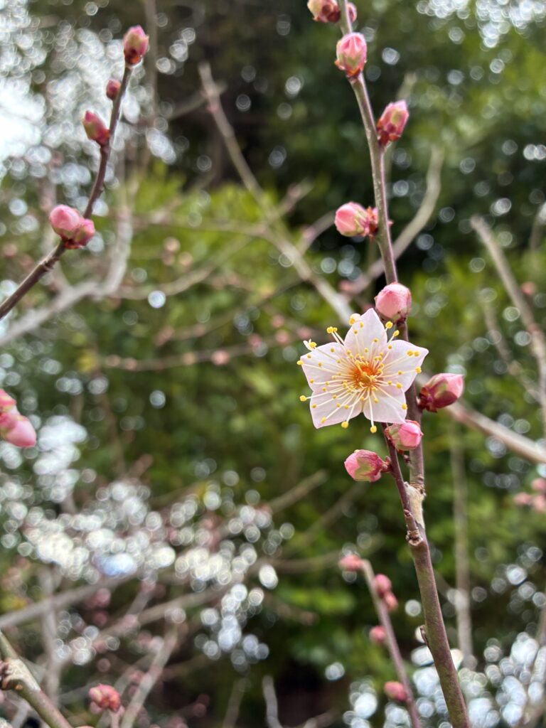 冬の園内に春の気配 佐布里梅(ソウリウメ)が咲き始めました
