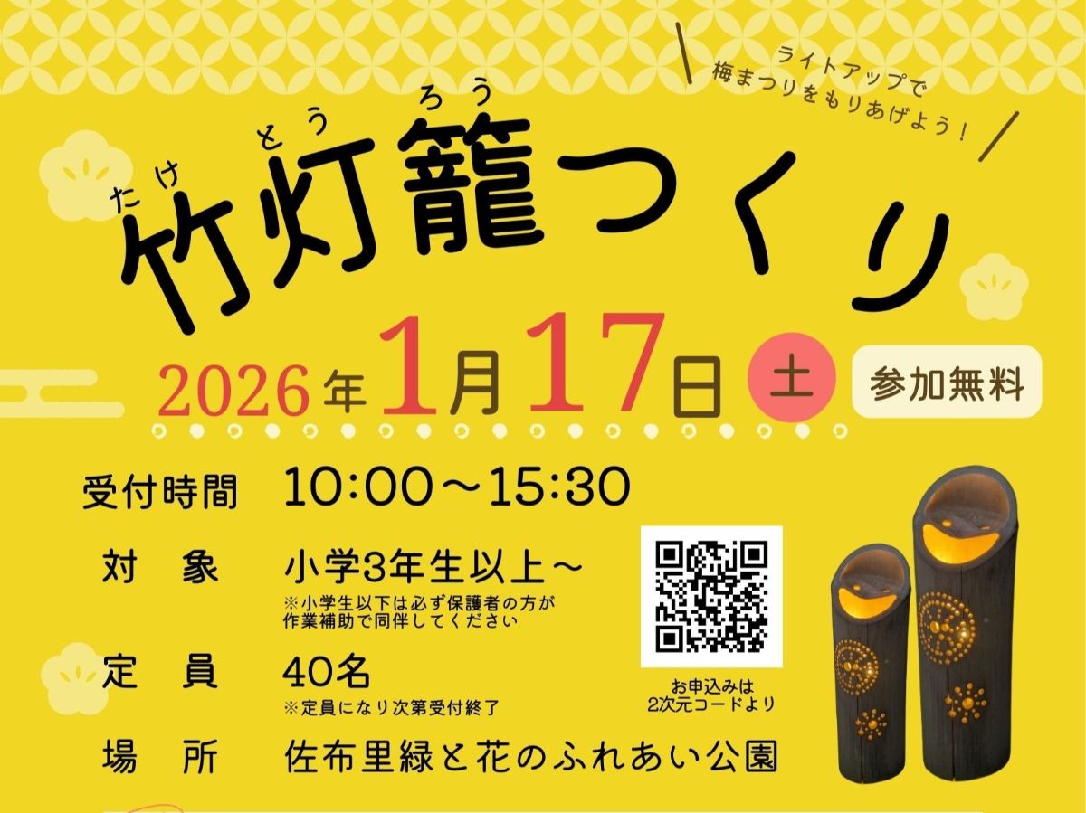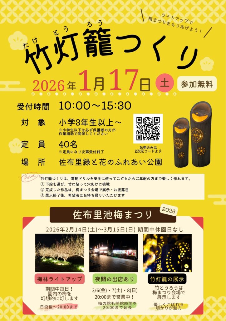 完成した竹灯籠は、佐布里池梅まつりの梅林ライトアップ会場に展示され、やさしい灯りで夜の梅まつりを彩ります。